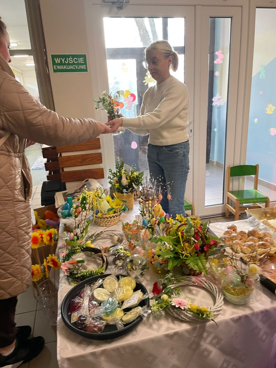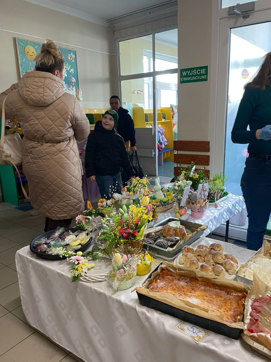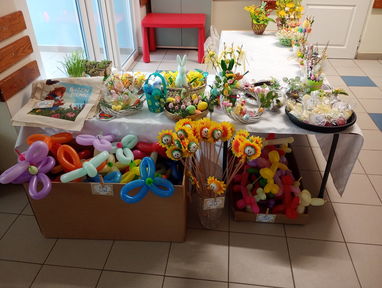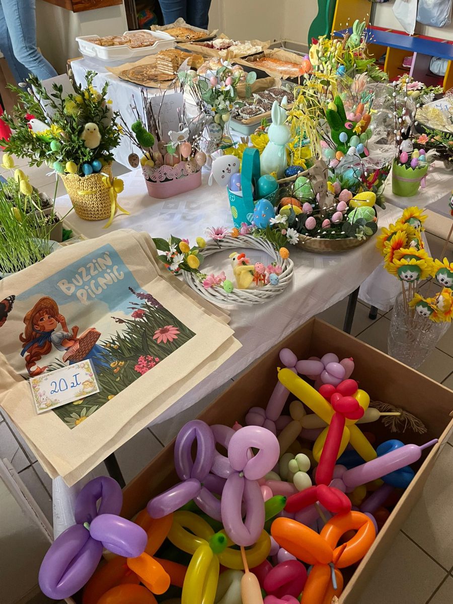 Na stoiskach można było znaleźć piękne stroiki wielkanocne wykonane wspólnie przez dzieci i rodziców podczas warsztatów w przedszkolu. Nie zabrakło także pysznych, domowych ciast upieczonych przez rodziców, kolorowych balonów oraz pachnących mydełek. 🎂🎈🧼