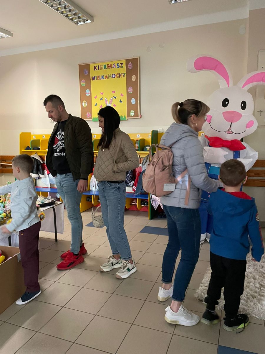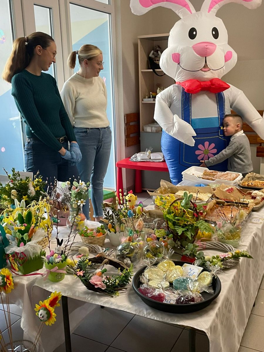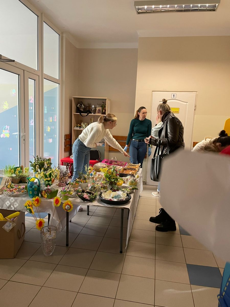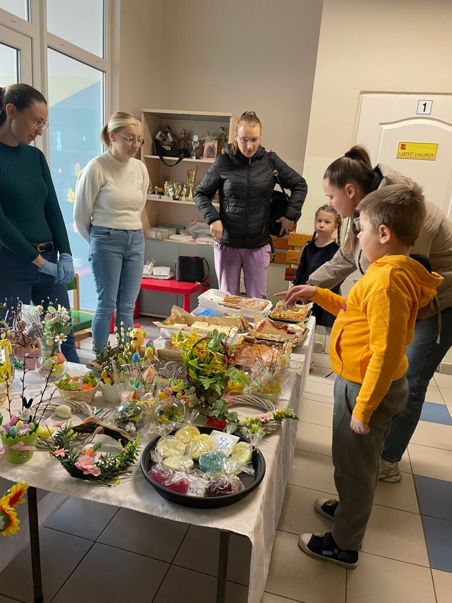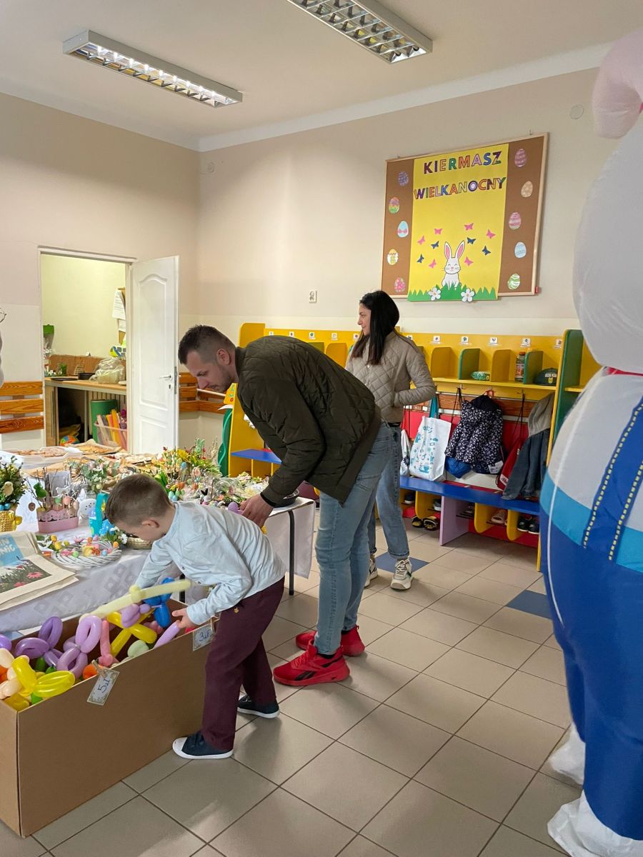 Na stoiskach można było znaleźć piękne stroiki wielkanocne wykonane wspólnie przez dzieci i rodziców podczas warsztatów w przedszkolu. Nie zabrakło także pysznych, domowych ciast upieczonych przez rodziców, kolorowych balonów oraz pachnących mydełek. 🎂🎈🧼