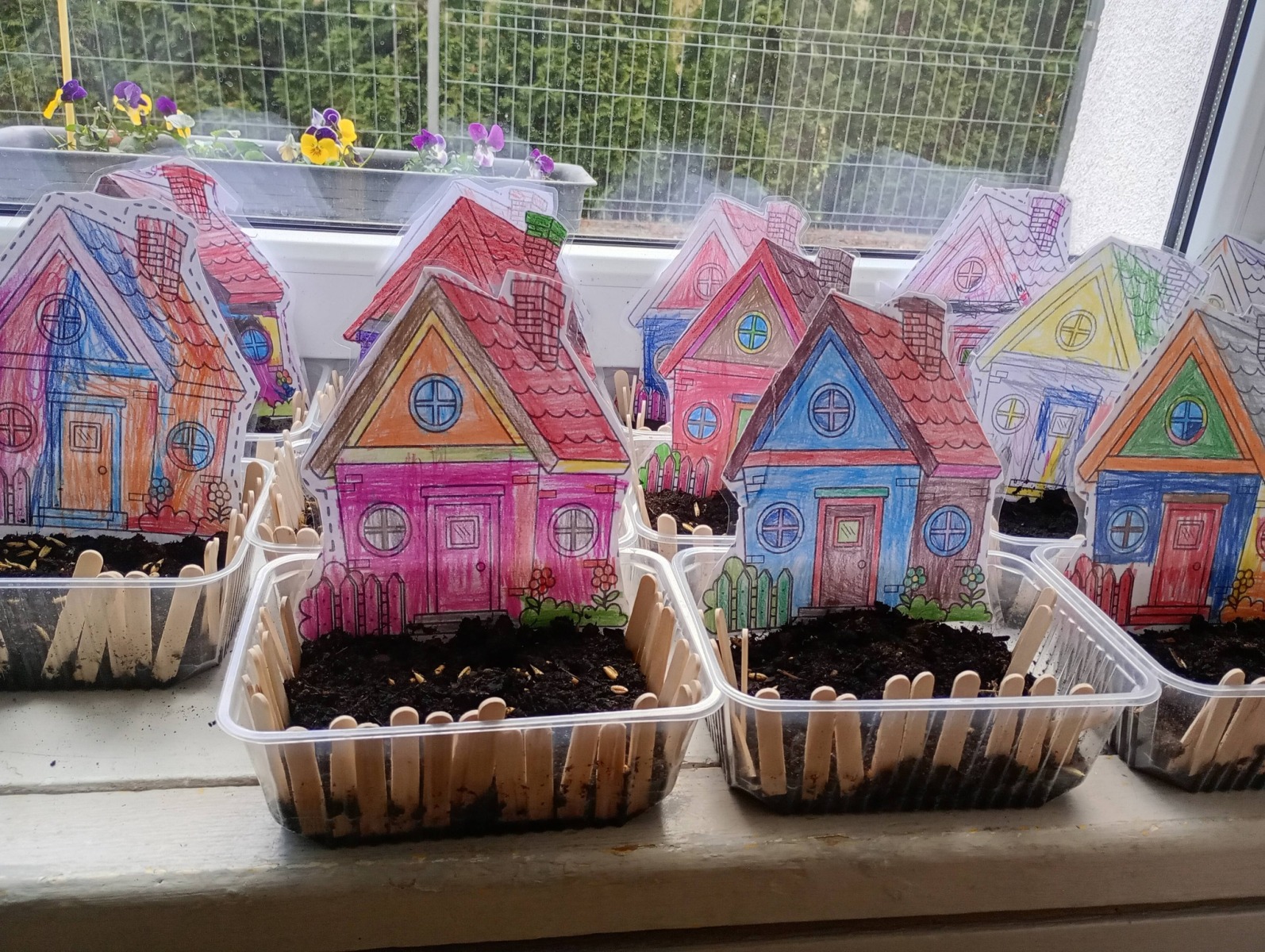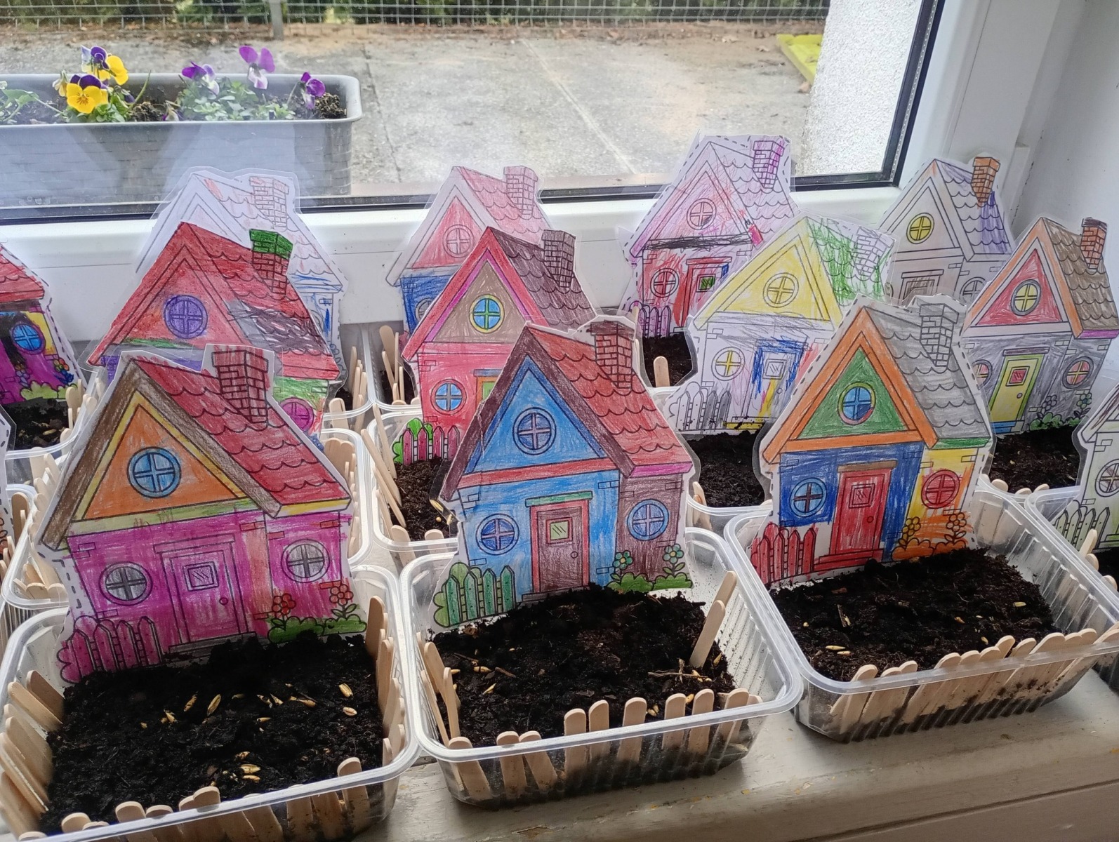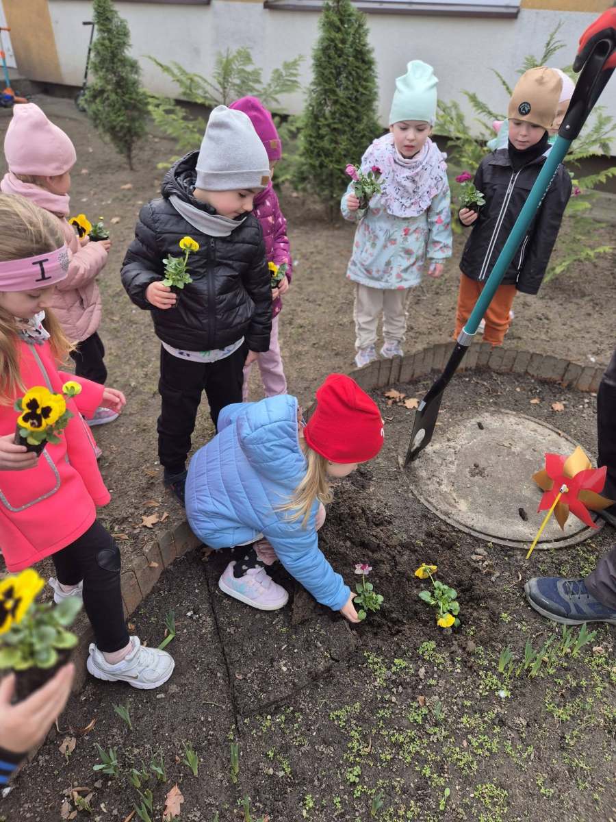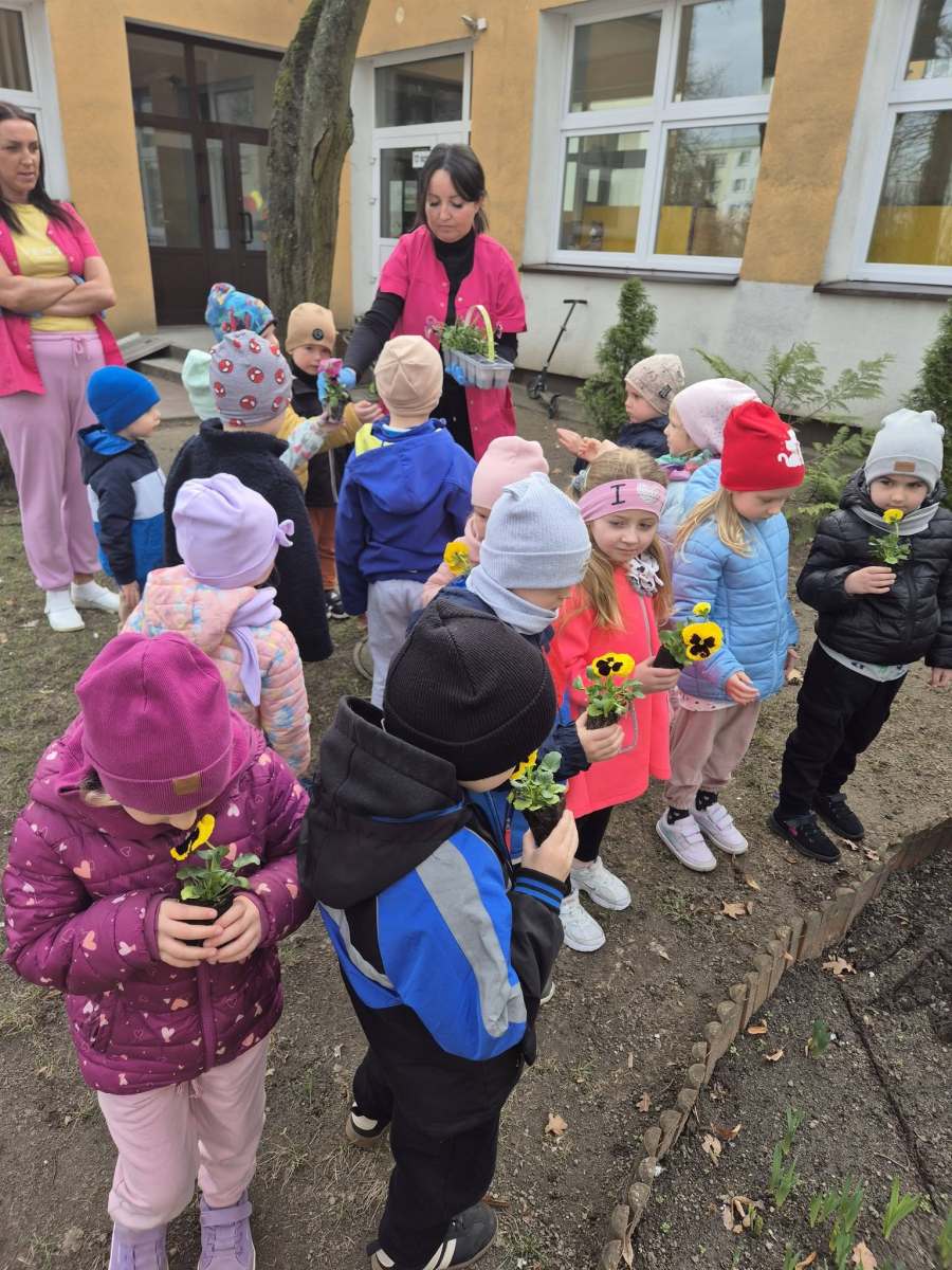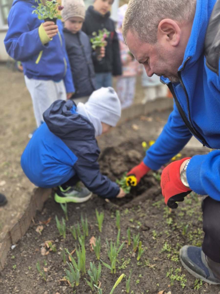 To jednak nie wszystko – nasze Pszczółki zadbały również o przedszkolny ogród, sadząc piękne, kolorowe bratki, które teraz będą ozdabiać nasze otoczenie i przypominać o nadchodzącej wiośnie. 🌸