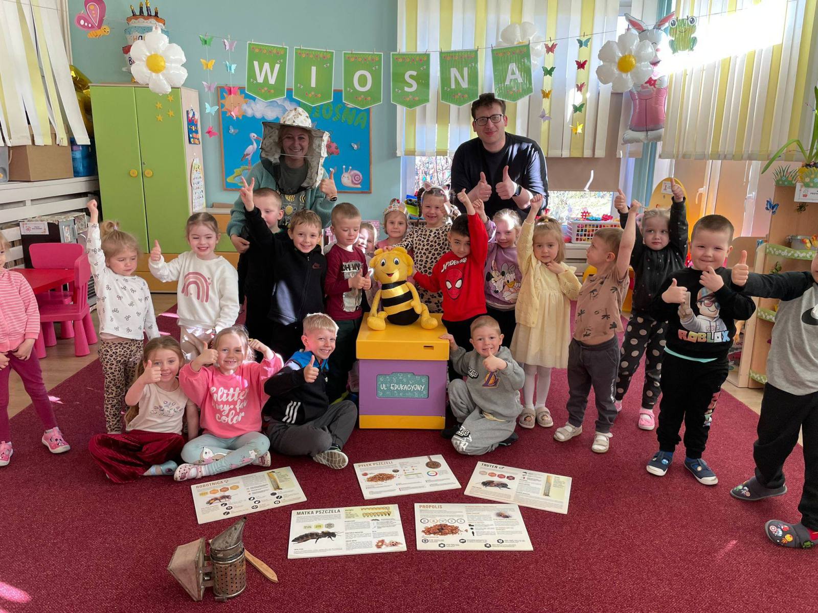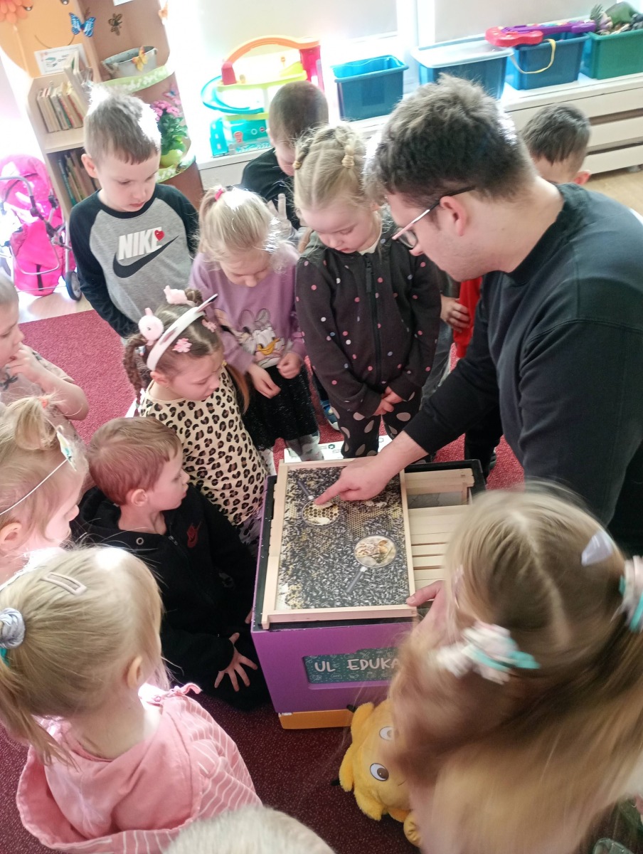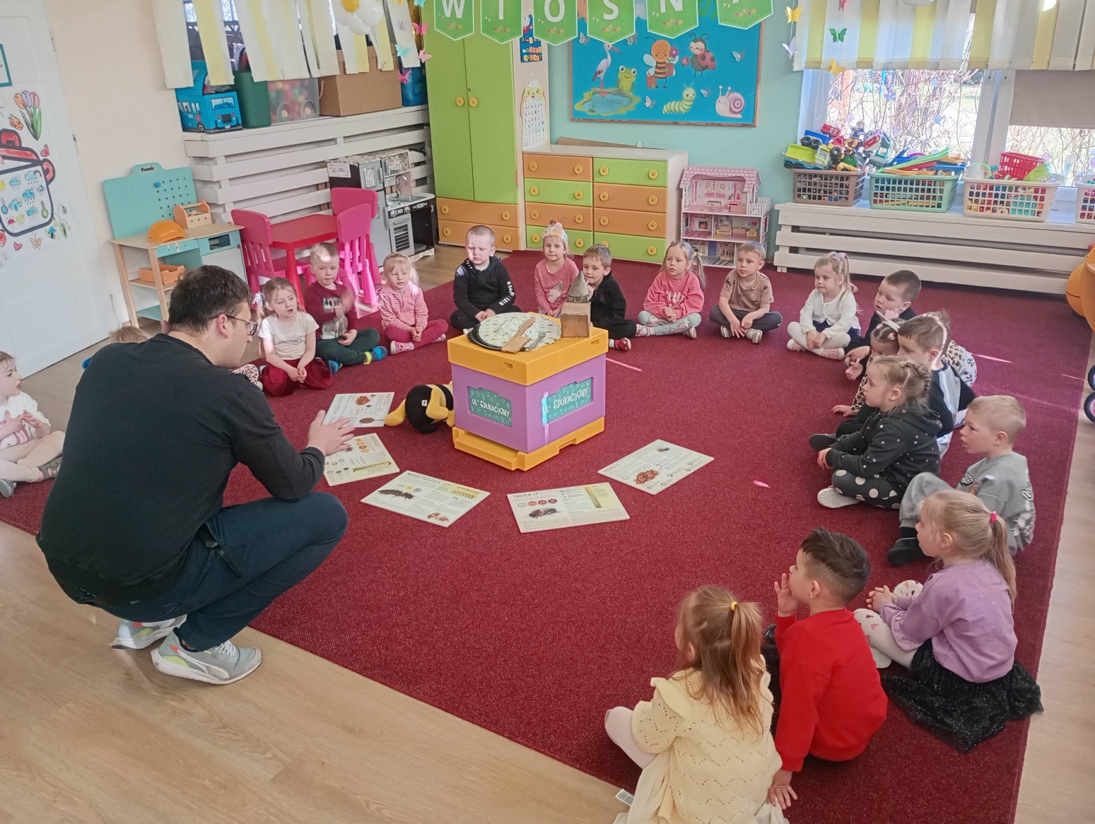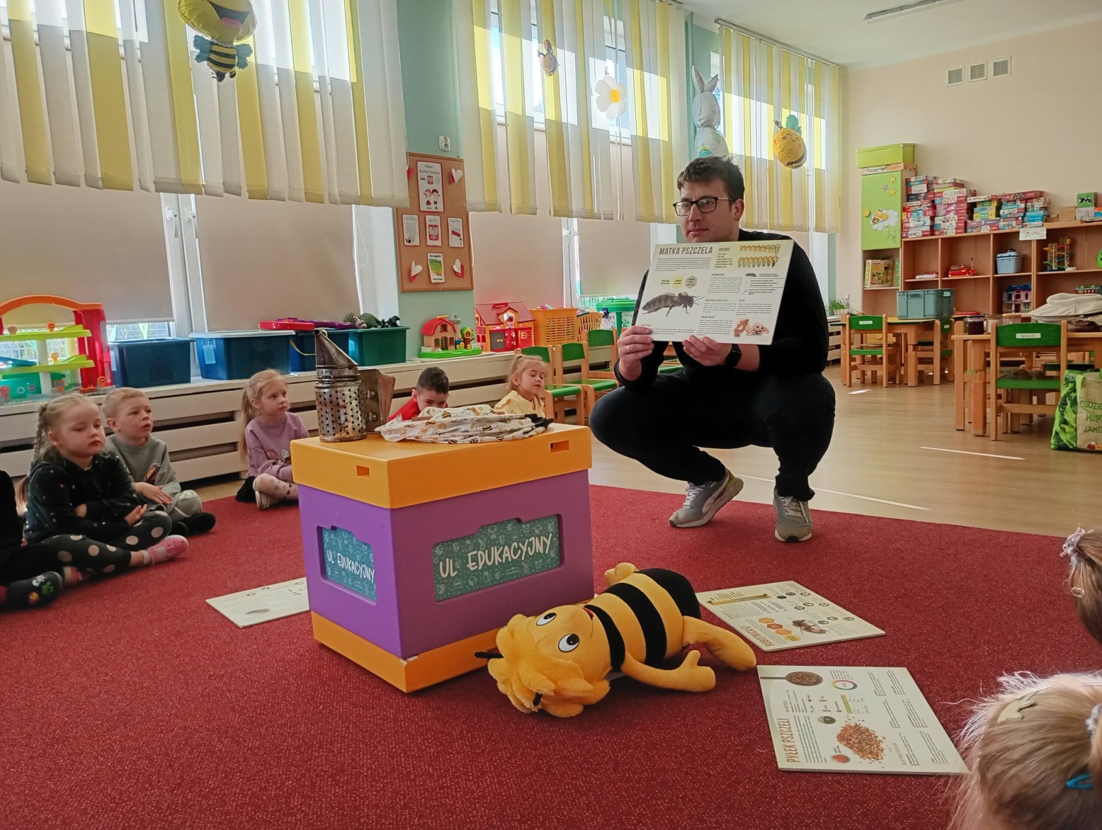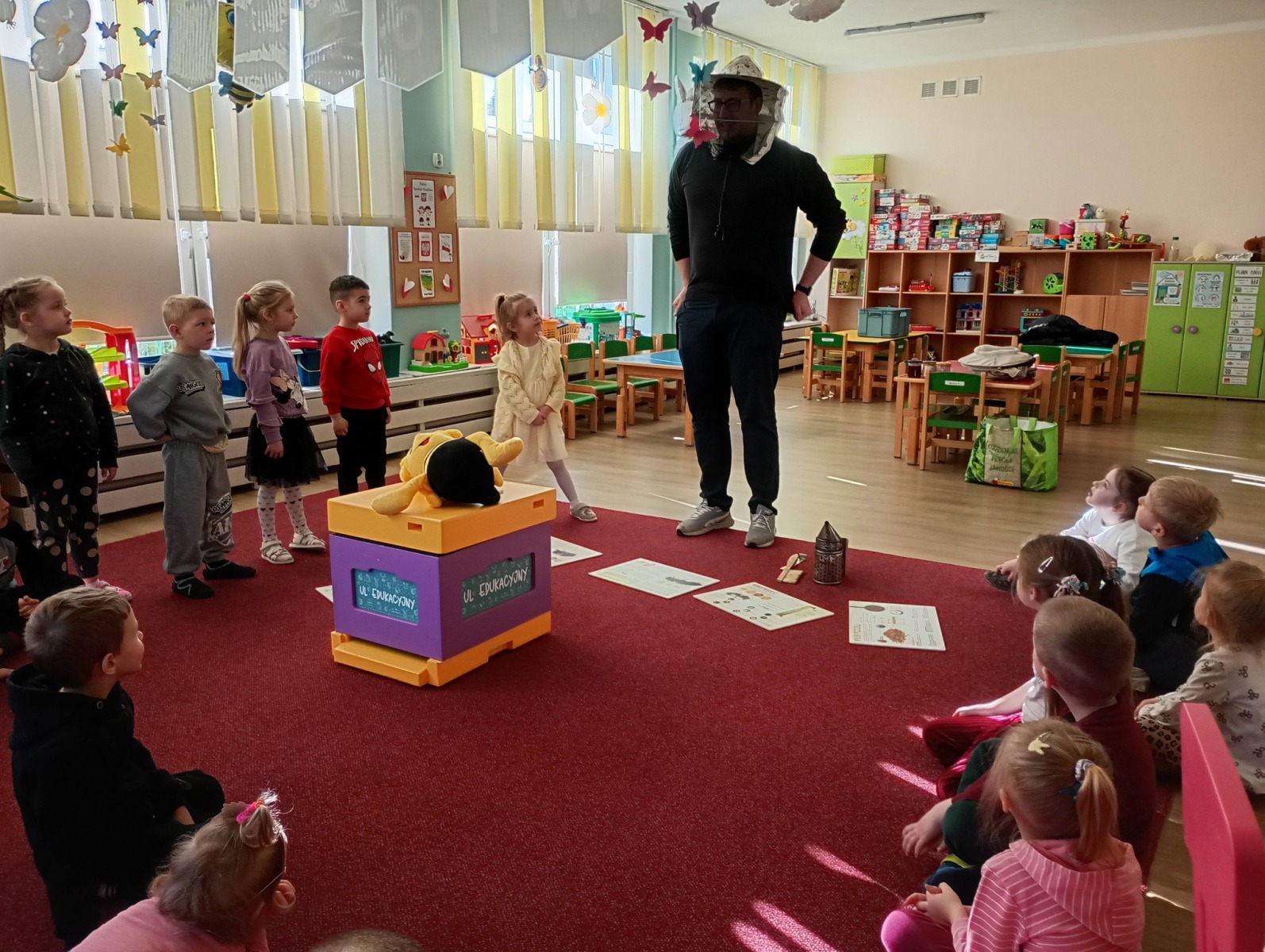 Przedszkolaki dowiedziały się, jak wygląda życie w ulu, jakie zadania mają poszczególne pszczoły oraz dlaczego są one tak ważne dla środowiska. Pan Mateusz w przystępny i pełen pasji sposób opowiadał o swojej pracy, prezentując także prawdziwy sprzęt pszczelarski oraz produkty pszczele.