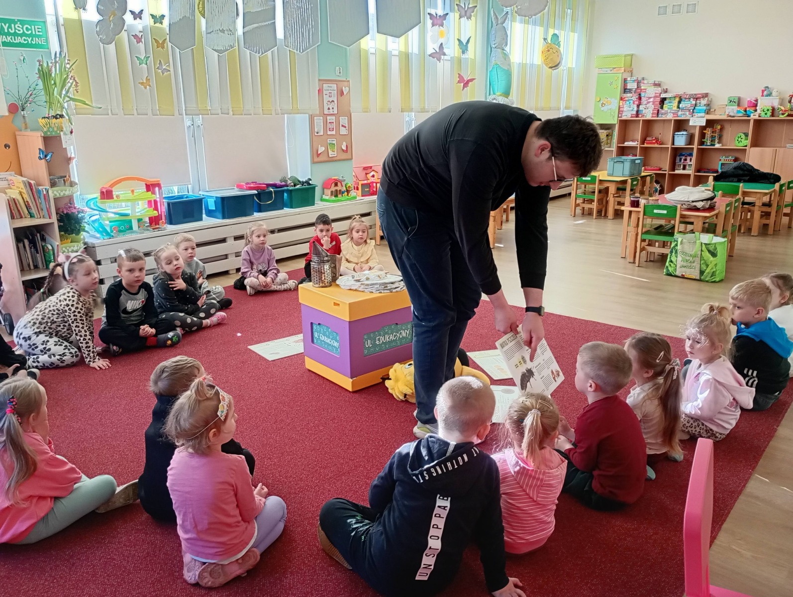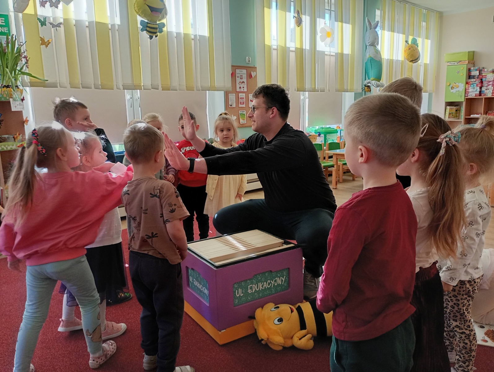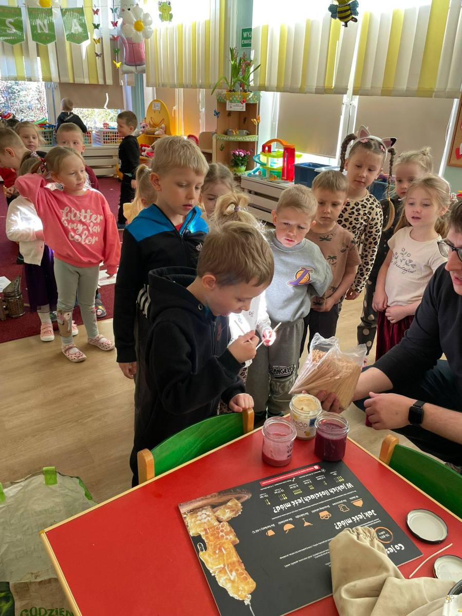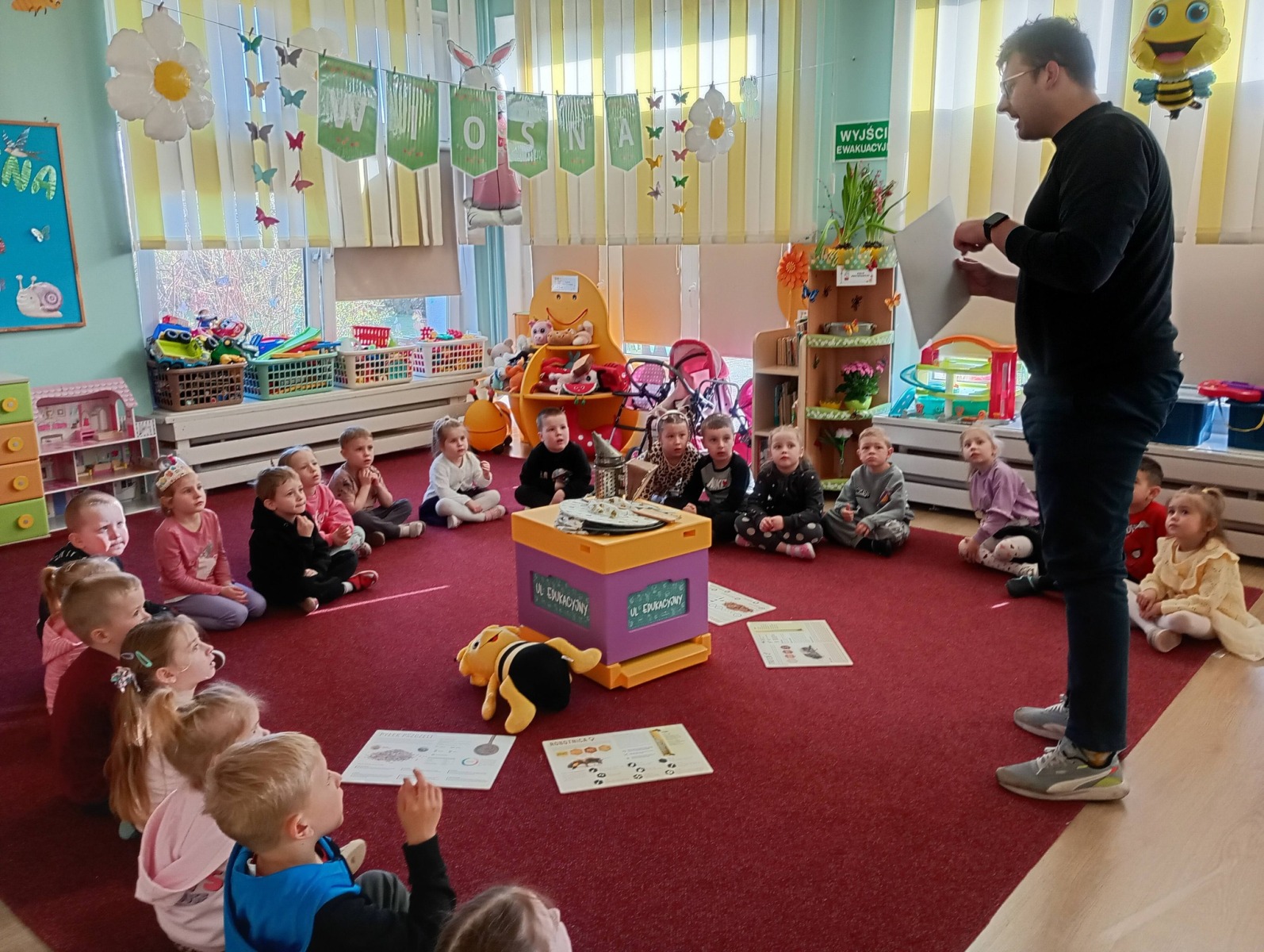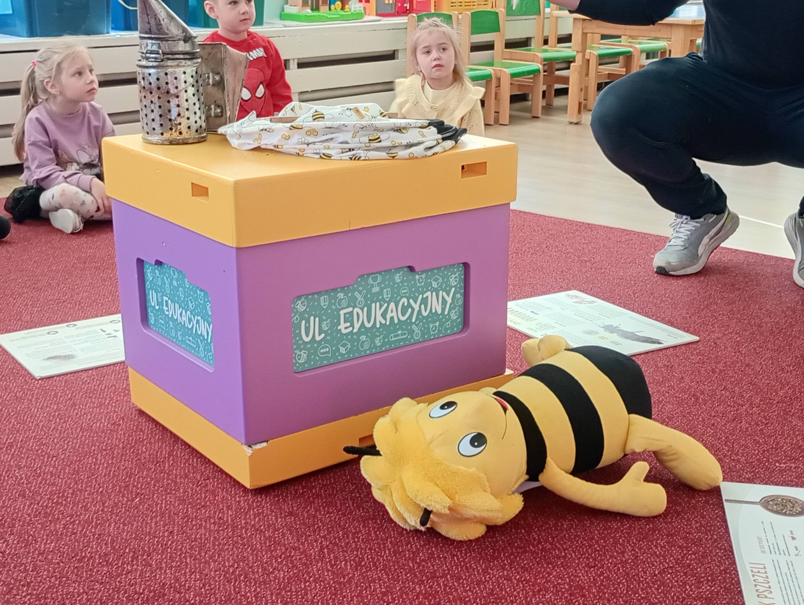 Przedszkolaki dowiedziały się, jak wygląda życie w ulu, jakie zadania mają poszczególne pszczoły oraz dlaczego są one tak ważne dla środowiska. Pan Mateusz w przystępny i pełen pasji sposób opowiadał o swojej pracy, prezentując także prawdziwy sprzęt pszczelarski oraz produkty pszczele.