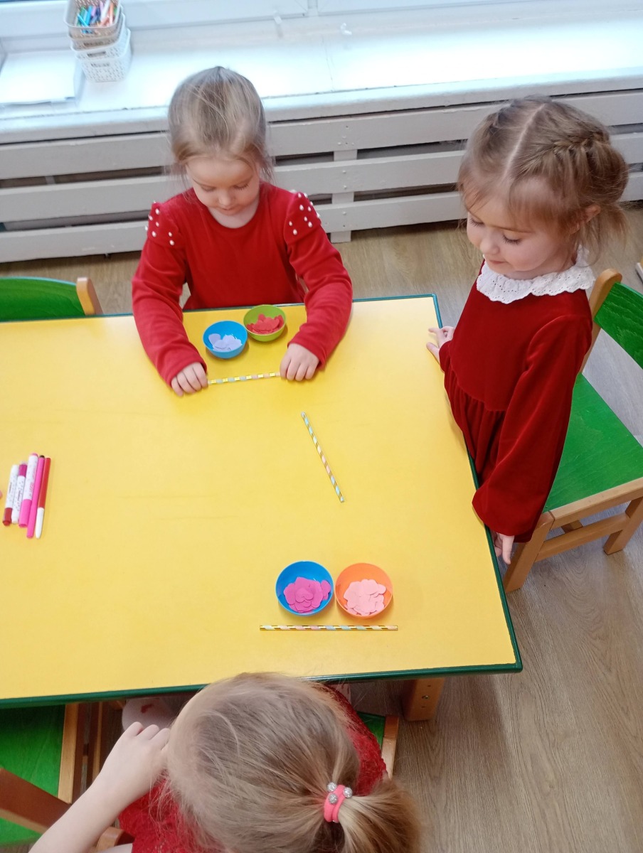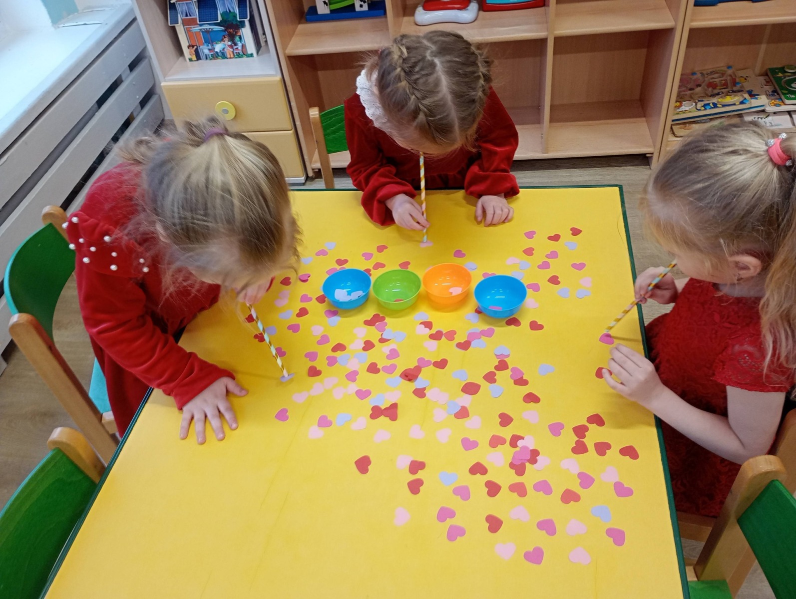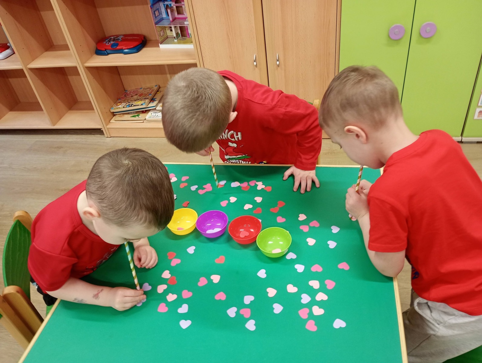 Podczas zajęć nie zabrakło empatycznych zabaw, które uczyły dzieci współpracy, uważności na emocje innych oraz wyrażania sympatii wobec kolegów i koleżanek. Przedszkolaki z wielkim zaangażowaniem brały udział w zabawie oddechowej – przy pomocy słomek segregowały „Kolorowe serduszka”, ćwicząc przy tym oddech, koncentrację i precyzję ruchów.