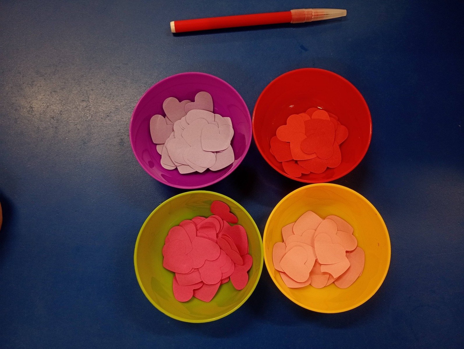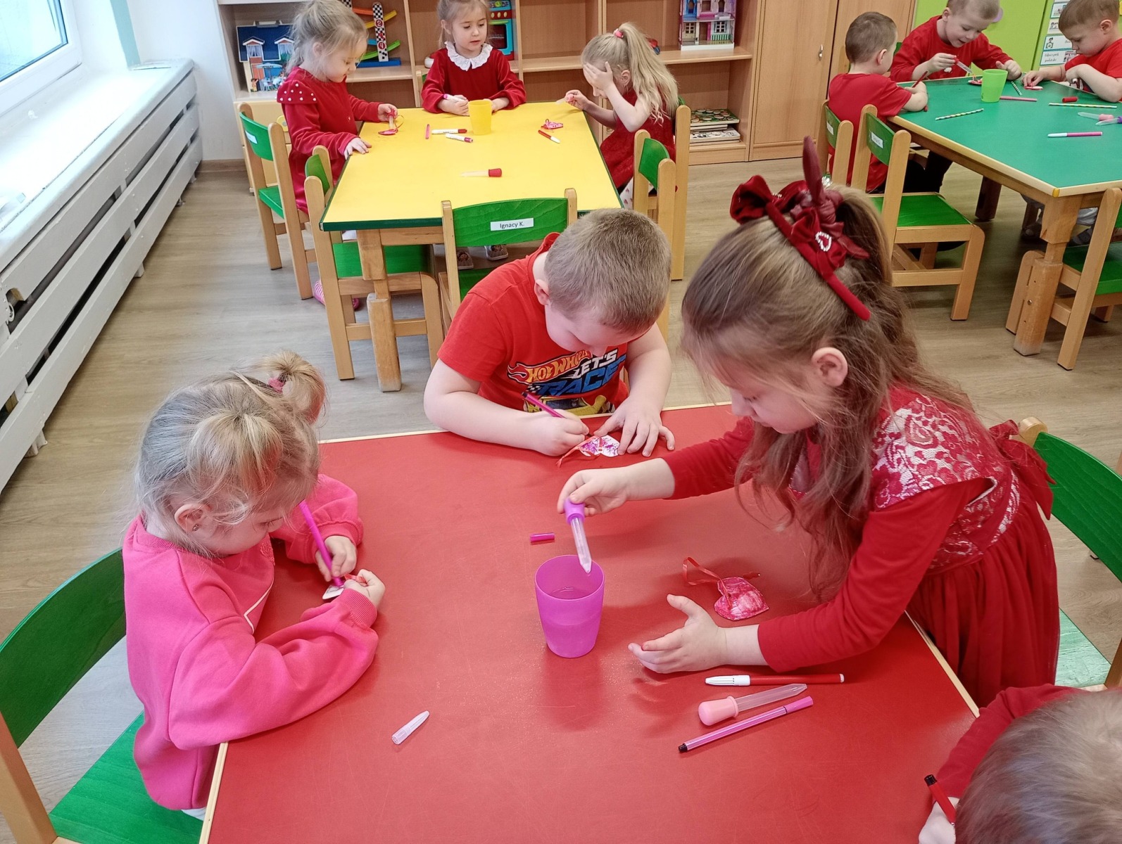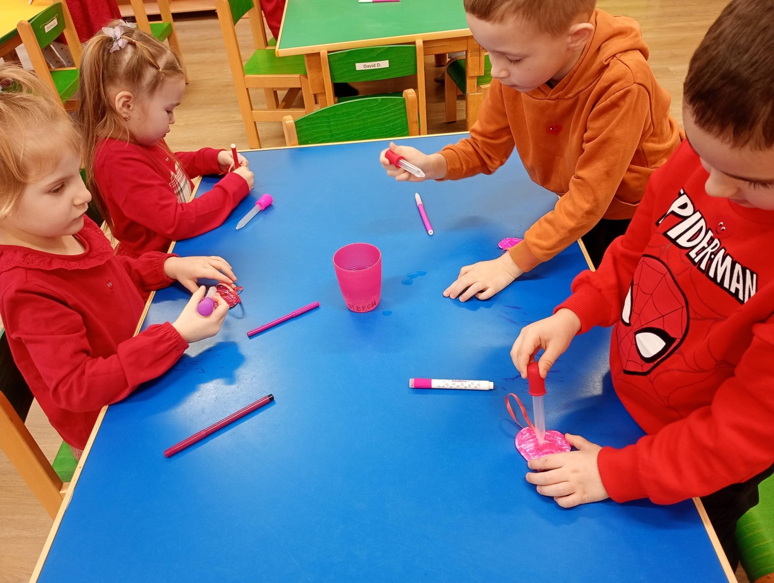 Ogromną radość sprawiła dzieciom także aktywność plastyczna. Pszczółki kolorowały serduszka na magicznym papierze, który po skropieniu wodą za pomocą pipet pięknie napęczniał i zmieniał swoją strukturę, tworząc niezwykłe, walentynkowe prace. Było dużo zdziwienia, zachwytu i twórczej zabawy!
