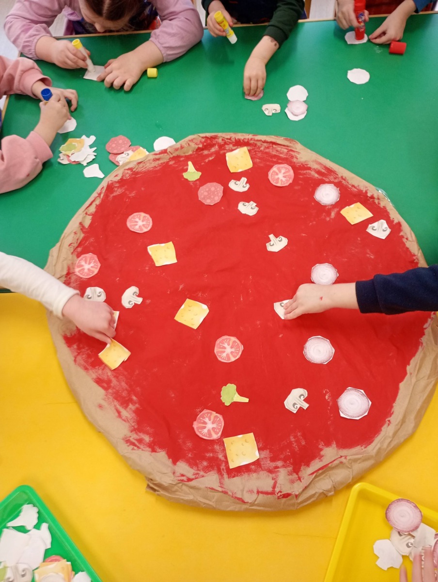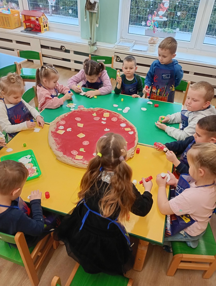 Dzieci wykonywały masażyki relaksacyjne, bawiły się w zabawy ruchowe, muzyczne i tematyczne związane z pizzą, a także wspólnie stworzyły wielką pizzę z papieru, rozwijając przy tym kreatywność i umiejętność współpracy.