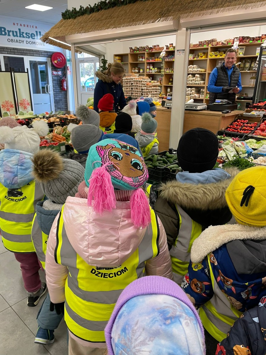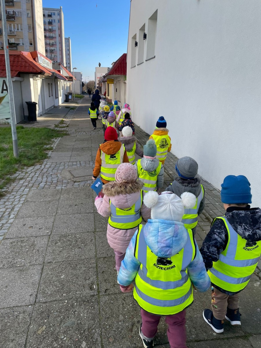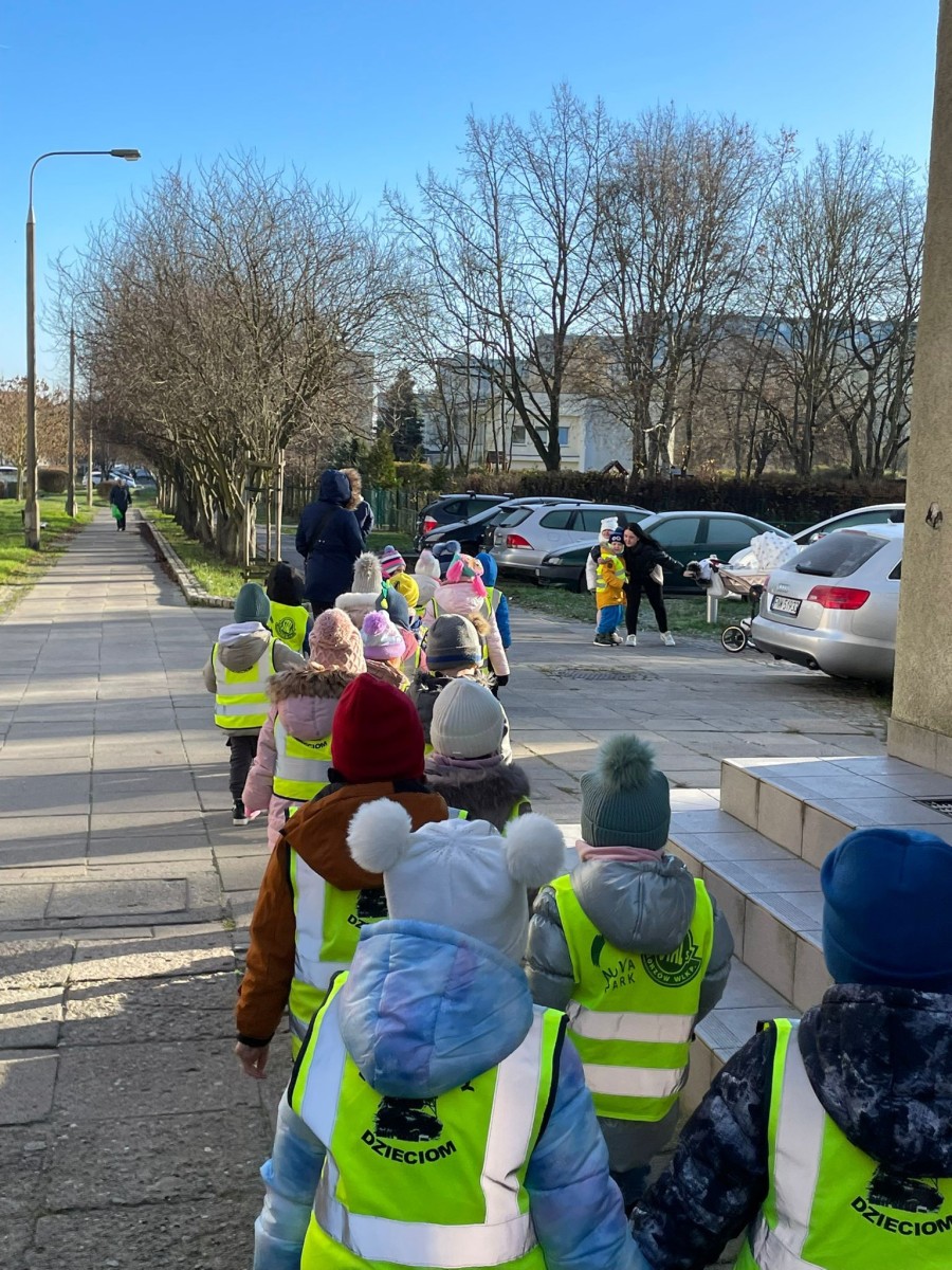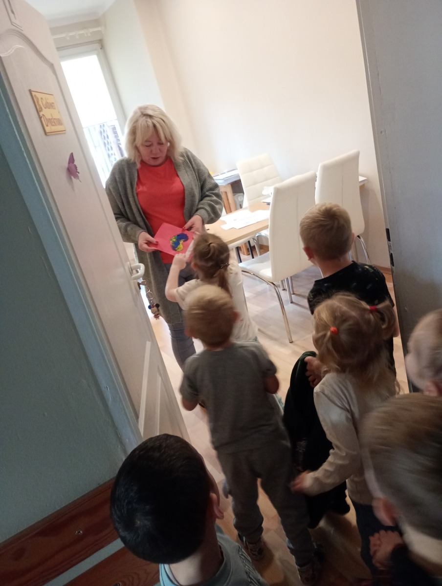Następnie Pszczółki wyruszyły w małą wyprawę, aby podzielić się dobrym słowem z innymi. Przedszkolaki wręczały kartki pracownikom sklepów, piekarni oraz spotkanym przechodniom, wywołując wiele uśmiechów i radości. To niezwykłe doświadczenie pokazało dzieciom, że nawet drobny gest może sprawić komuś ogromną przyjemność.
