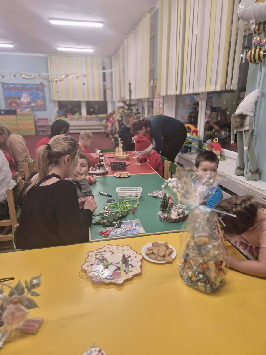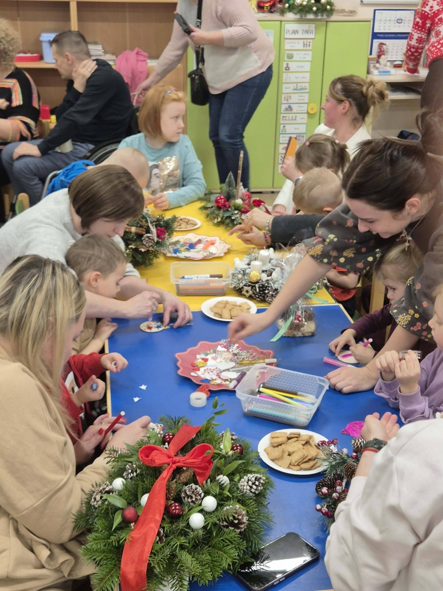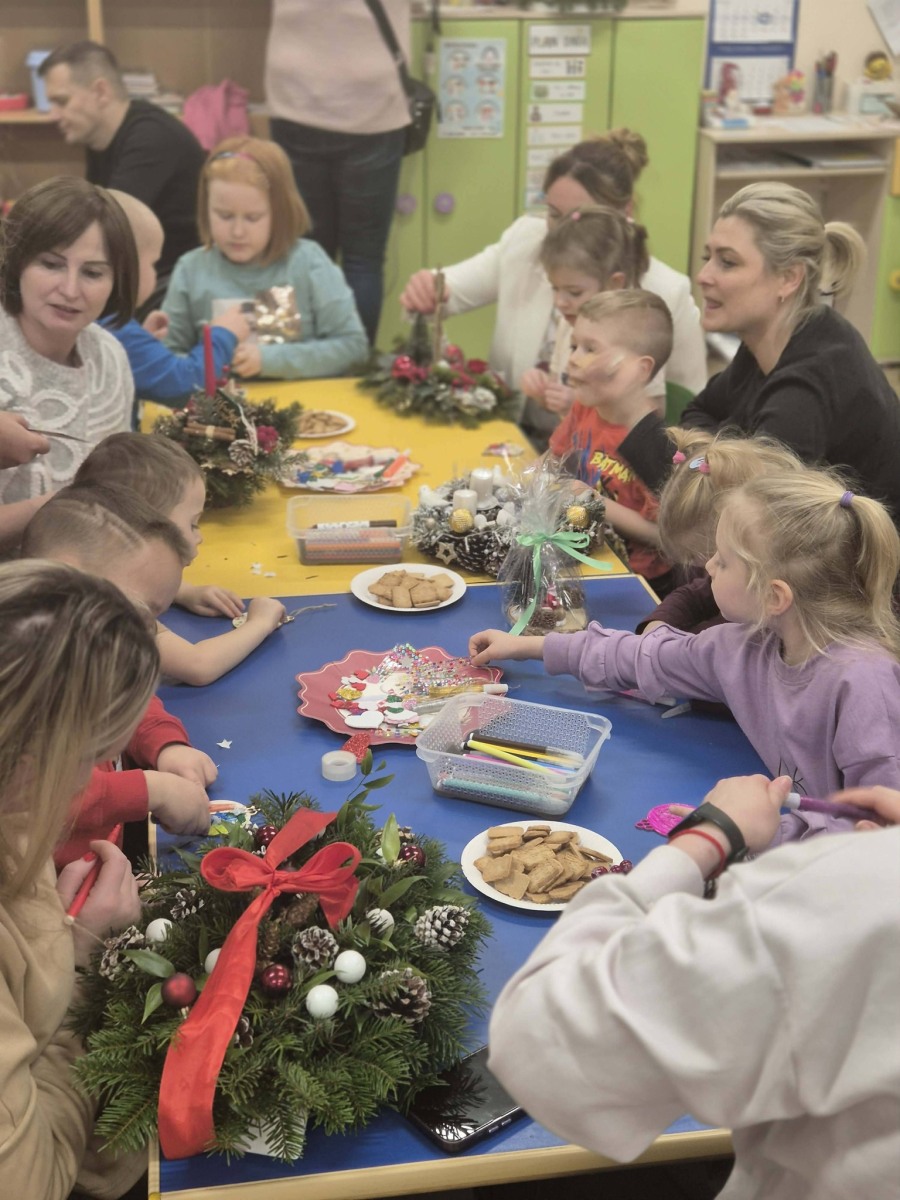 Podczas warsztatów dzieci wspólnie z rodzicami bawiły się oraz tworzyły piękne stroiki bożonarodzeniowe. Wspólna praca sprzyjała rozmowom, integracji oraz wzmacnianiu więzi między dziećmi, rodzicami i przedszkolem. Powstałe stroiki zachwycały pomysłowością i świątecznym klimatem.